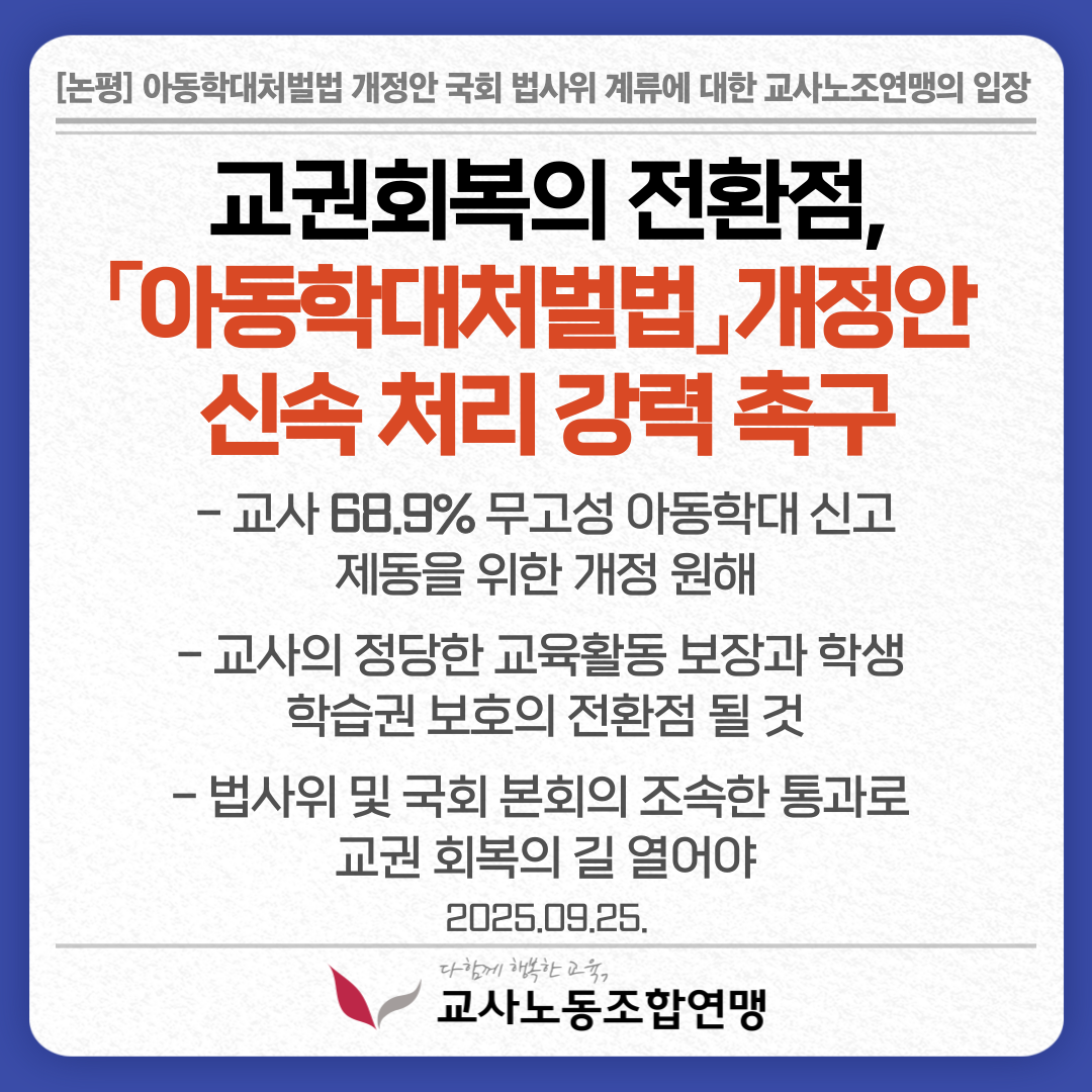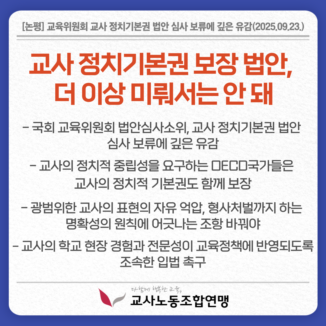 교육위원회 교사 정치기본권 법안 심사 보류에 관한 교사노조연맹의 입장