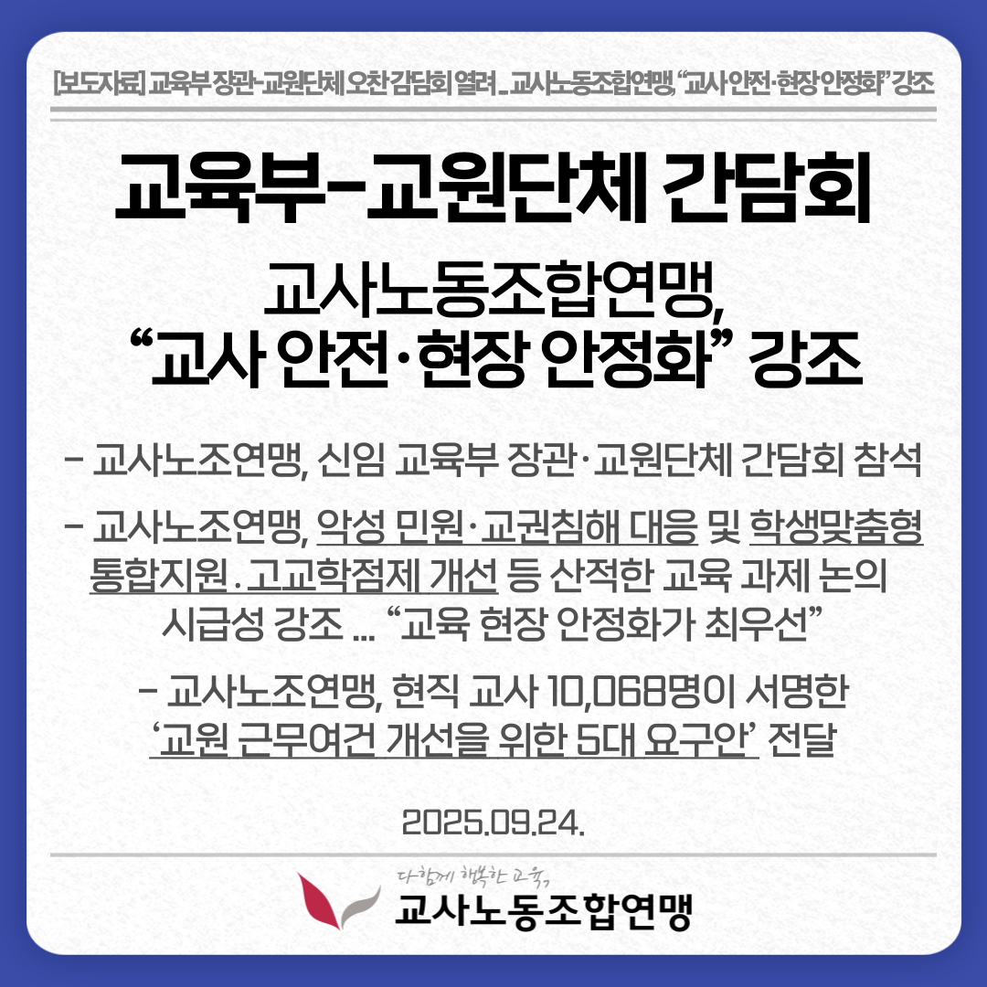 교육부-교원단체 간담회 참석 ... 교사노동조합연맹, “교사 안전·현장 안정화” 강조