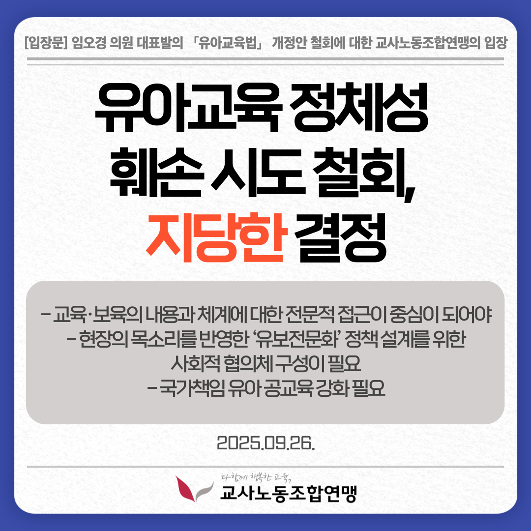 임오경 의원 대표발의 「유아교육법」 개정안 철회에 대한 교사노동조합연맹의 입장