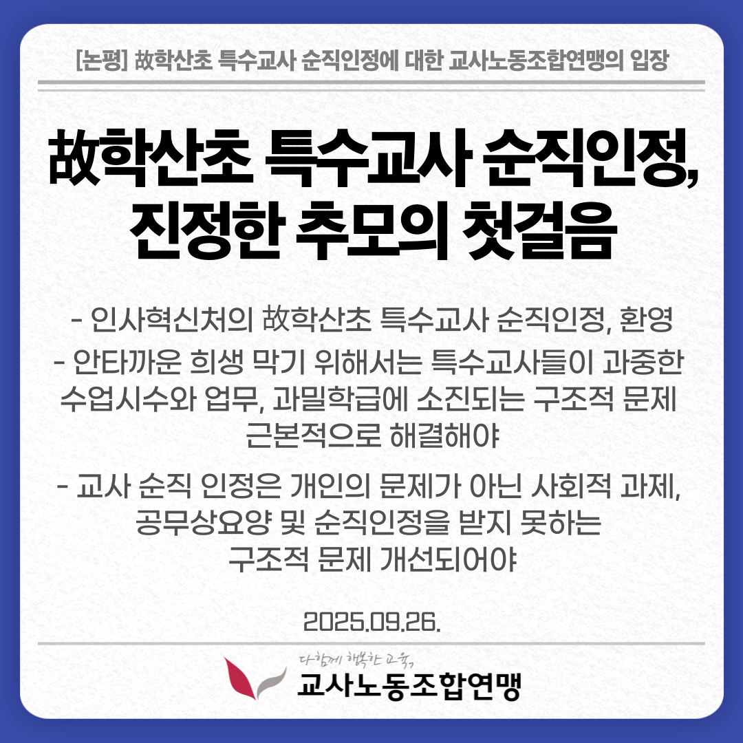 故학산초 특수교사 순직인정에 대한 교사노동조합연맹의 입장(2025.09.26.)