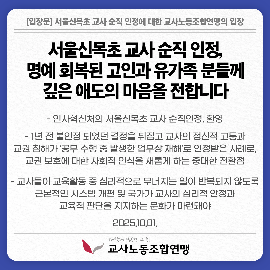 서울신목초 교사 순직 인정, 명예 회복된 고인께 깊은 애도의 마음을 전합니다 (2025.10.01)