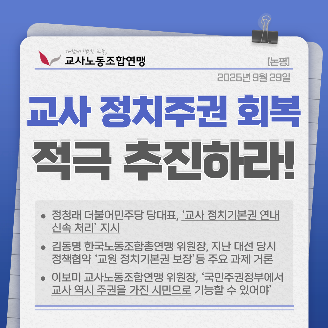 더불어민주당 ‘교사 정치기본권 신속 추진’ 입장 적극 환영(2025.09.29.)