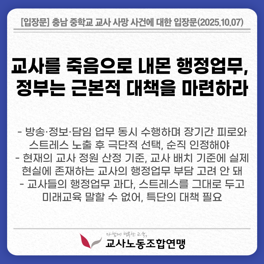 충남 중학교 교사 사망 사건에 대한 입장문(2025.10.07)
