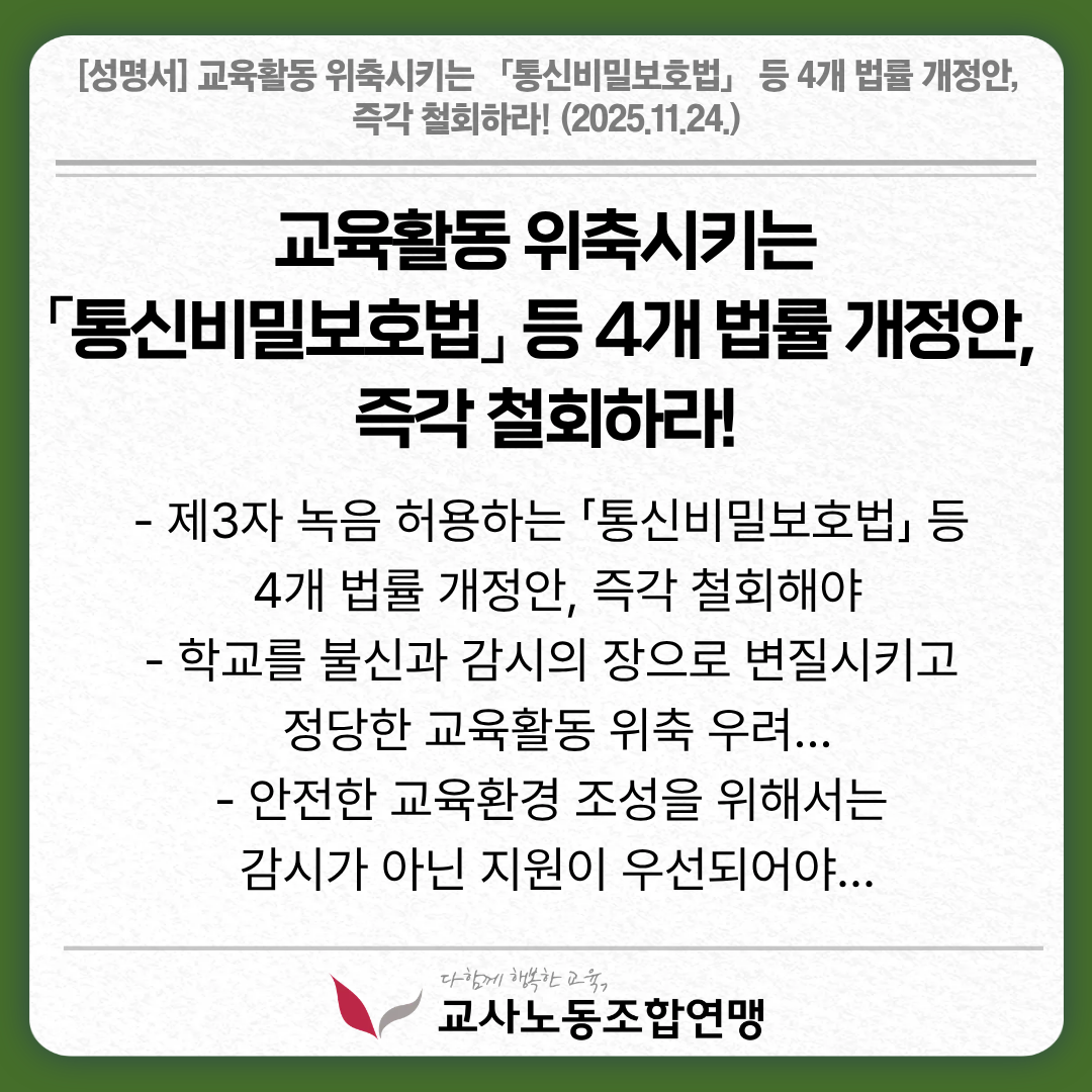 교육활동 위축시키는 「통신비밀보호법」 등 4개 법률 개정안, 즉각 철회하라! (2025.11.24.)
