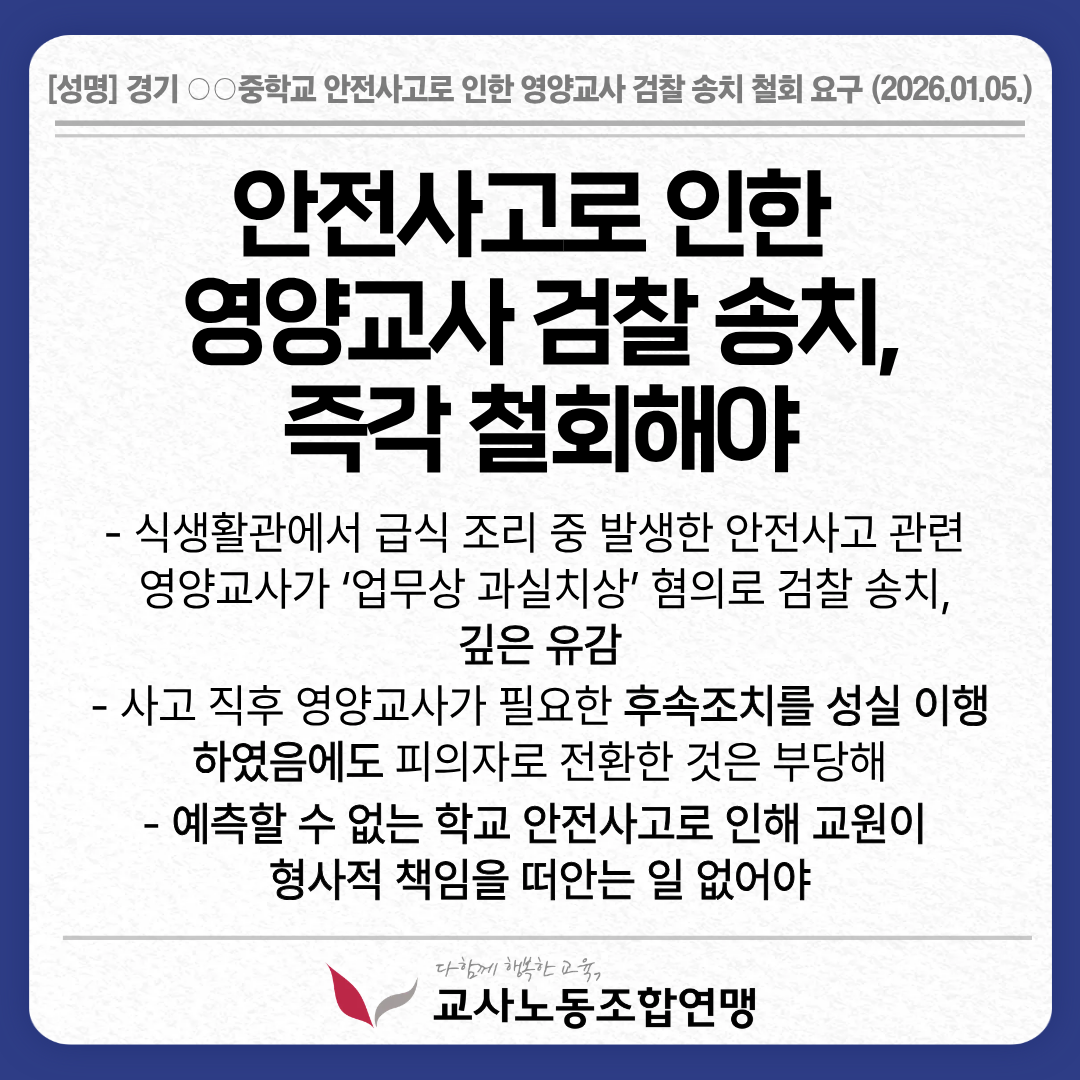 경기 ○○중학교 안전사고로 인한 영양교사 검찰 송치 철회 요구 (2026.01.05.)